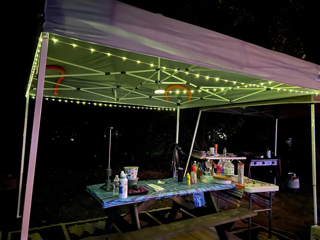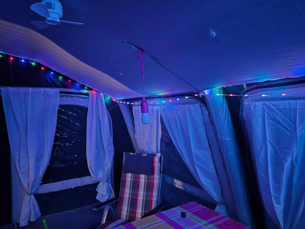 Wähle zwischen warmem Licht, farbigen Effekten oder einem sanften Atemlicht für eine angenehme Atmosphäre rund ums Zelt.