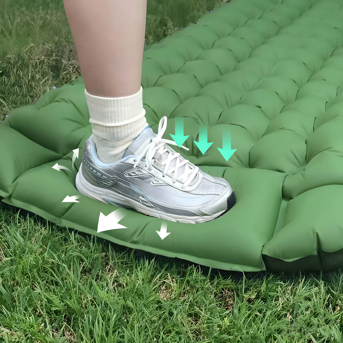 Vergiss die Luftpumpe! Die clevere integrierte Fußpumpe bläst die Matte in nur 30–60 Sekunden vollständig auf – ganz ohne Kraftaufwand.