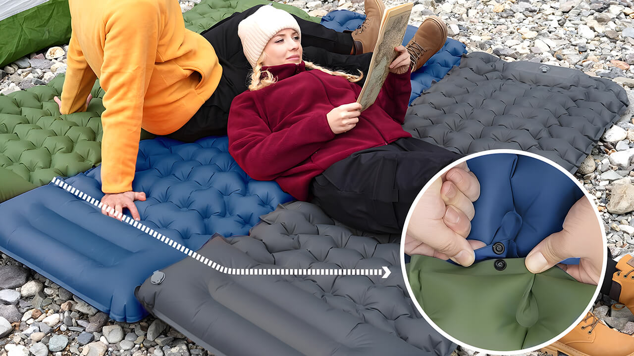 Die Isomatte wird in einem Aufbewahrungsbeutel mit u.a. deutscher Anleitung und drei Reparatur Klebeflicken geliefert. Der Beutel ist ca. 15cm x 32 cm breit/hoch und etwas weniger als 15cm dick, und ist ber ein Zugband mit Stopper verschließbar. Das Gewicht ist mit 837g erfreulich niedrig, das Material der dnnen Luftmatraze macht einen vertrauenswrdigen Eindruck. Mittels der eingebauten Schwammpumpe wird die Matte relativ komfortabel auf eine Größe von gemessen ca. 188 cm Länge und 70 cm Breite ohne Anstrengung aufgepumpt Die Dicke der recht ungew?hnlich strukturierten Luftkammer beträgt etwa 6 cm an der Liegefläche, und ca. 13cm am Kopfteil. Die Isomatte kann mit vorhandenen, aber ehrlich gesagt recht einfachen und nicht gerade berdimensioniert erscheinenden seitlichen Druckkn?pfen ggf. mit weiteren Matten vom gleichen Typ zusammengeknöpft werden.