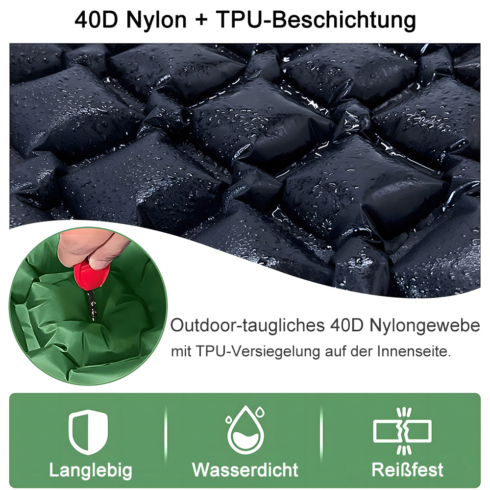 Gefertigt aus robustem 40D Nylongewebe mit einer wasserdichten Schicht, ist diese Schlafmatte darauf ausgelegt, den härtesten Outdoor-Bedingungen standzuhalten. Ob Regen, Felsen oder unebenes Gelände – du kannst dich darauf verlassen, dass deine Schlafmatte strapazierfähig, widerstandsfähig und perfekt für Abenteuer geeignet ist.