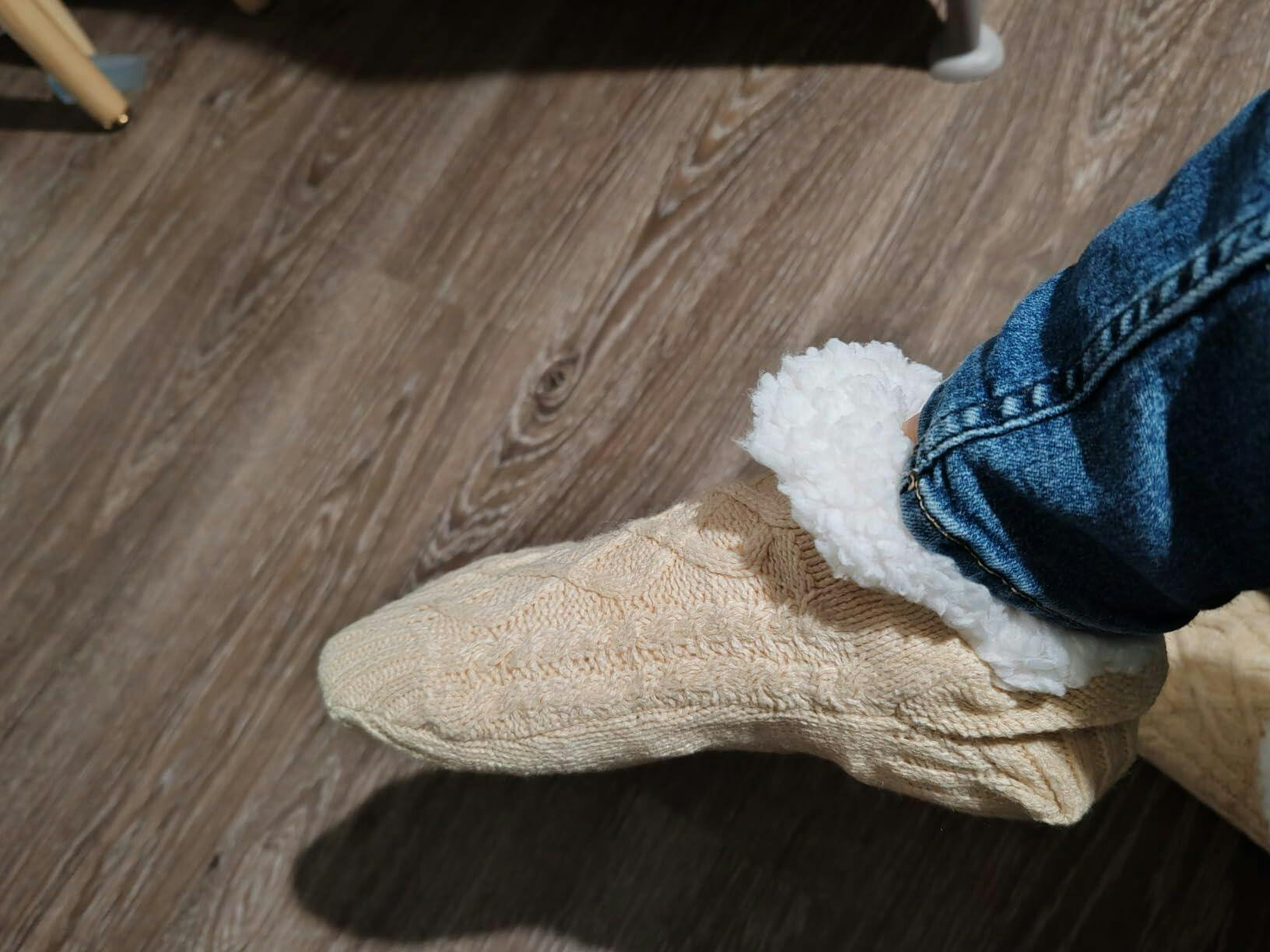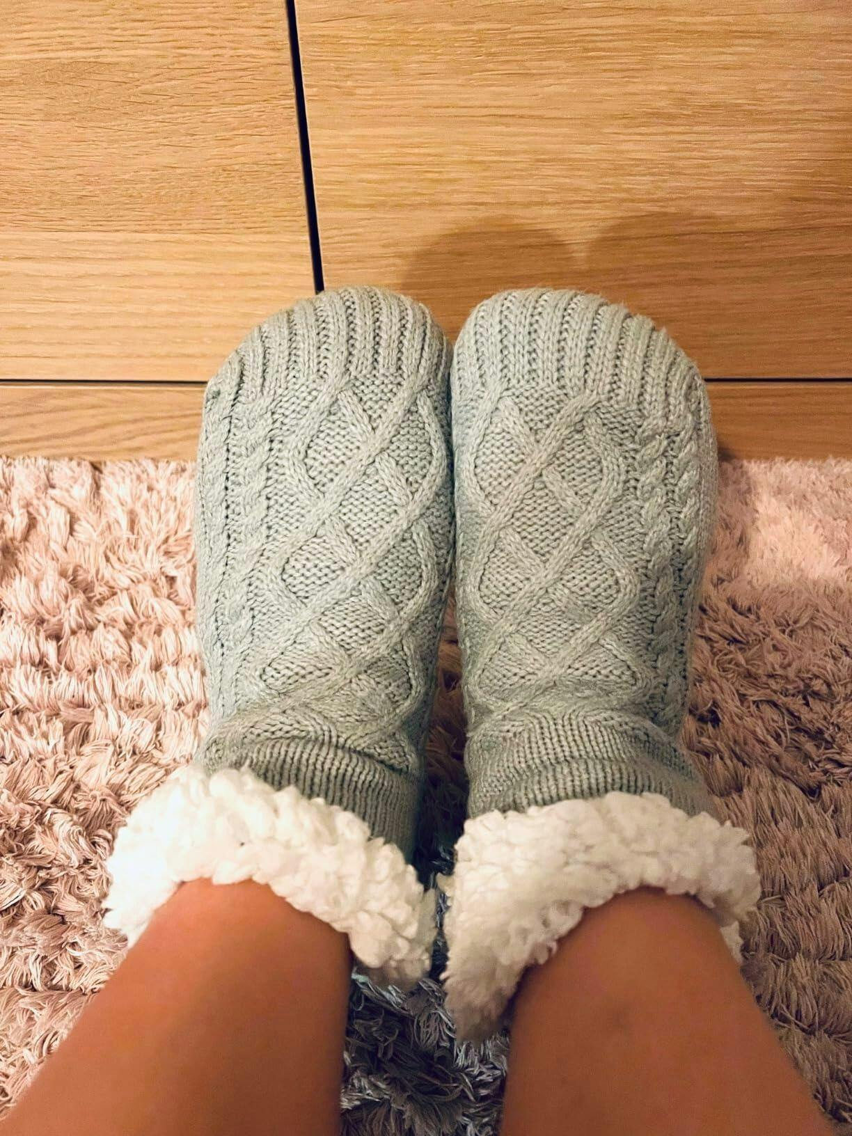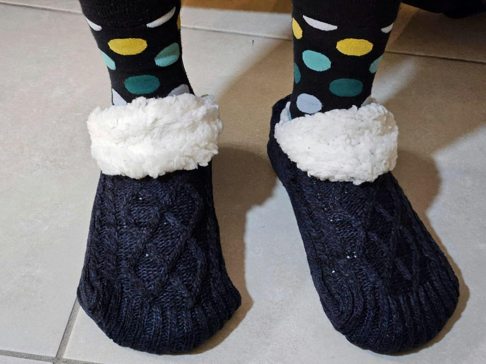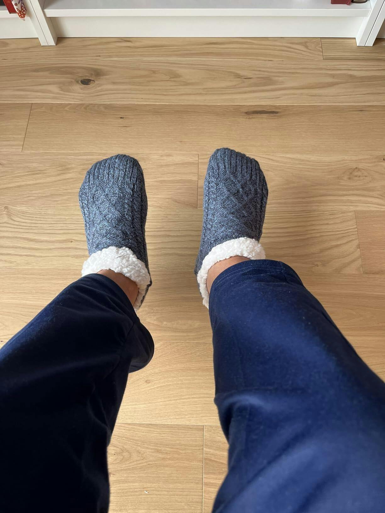Ich bin zu Hause gerne barfuß, deshalb mag ich diese Überziehsocken lieber als Hausschuhe mit festen Sohlen.