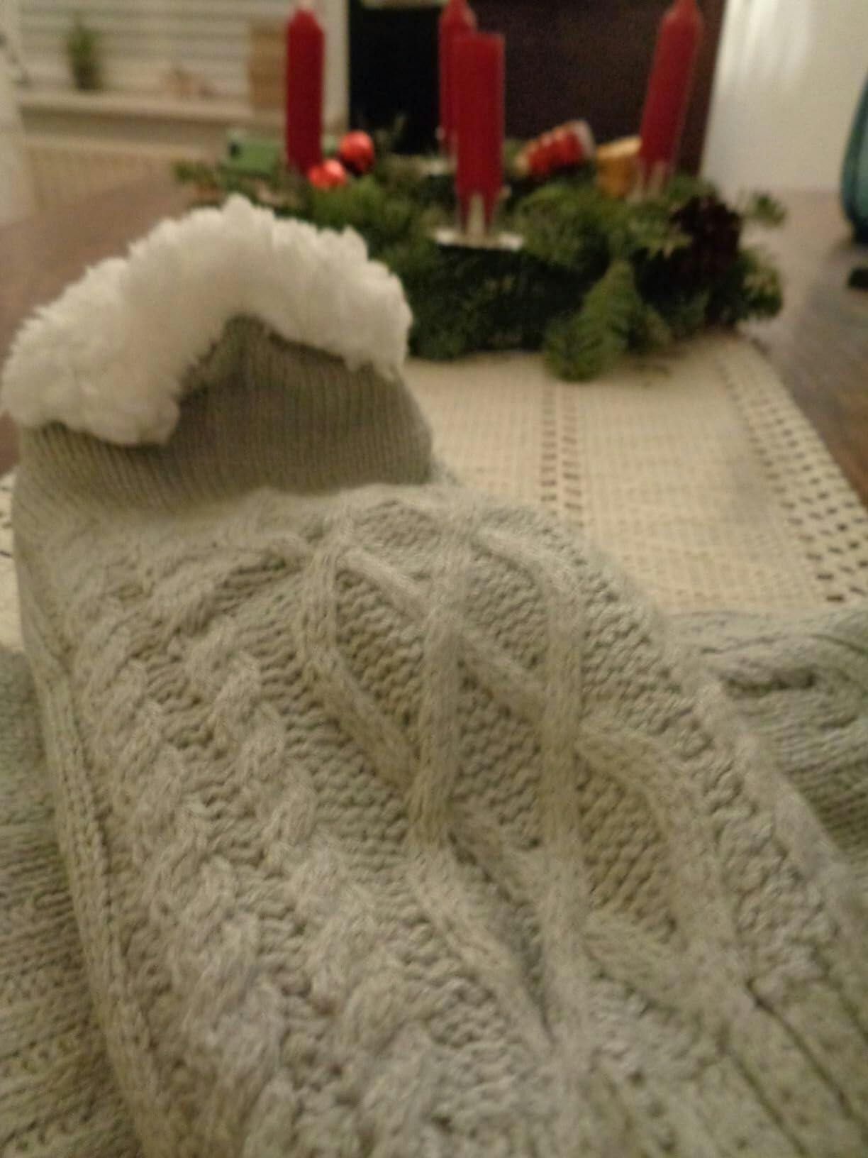 Durch das Gestrick im Zopf- bzw. Aranmuster halten sie die Wärme besonders gut (Wärme entsteht bei Wolle durch die erwärmte Luft zwischen den Maschen beziehungsweise dem Gestrick selbst, dort, wo es erhaben erscheint.) Auf sehr fußkalten Böden sind sicherlich Filzpantoffeln besser, ich wollte die Socken aber zum Lesen auf der Couch bzw. dem Bett. Zudem sind sie etwas eleganter als Pantoffeln.