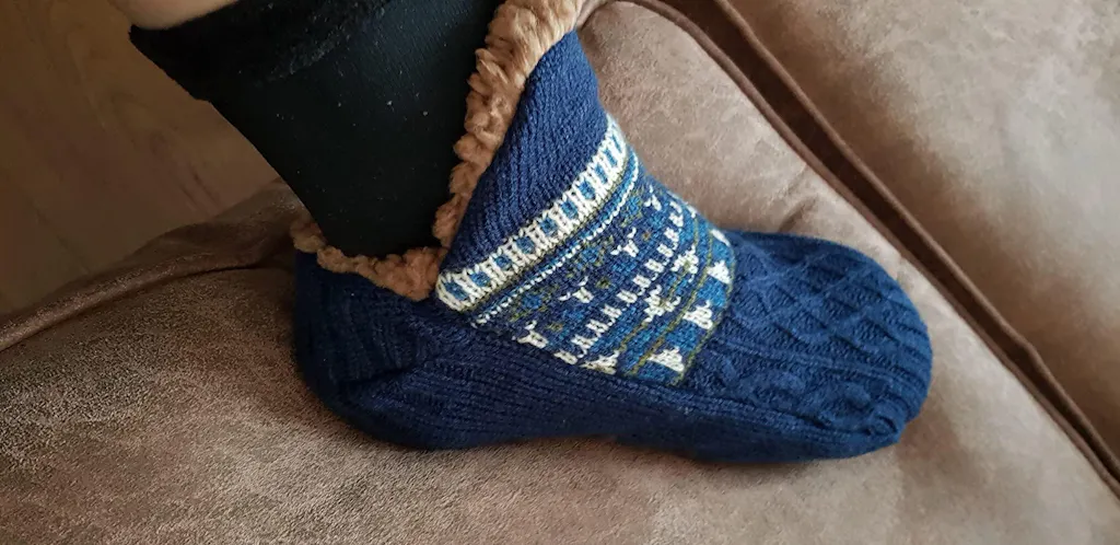 Zugegeben, sie sind nicht aus Wolle (zum Glück – also kein Kratzen), sondern aus einem superweichen, synthetischen Fleece-Material mit einer flauschigen, fellähnlichen Innenseite und einer hübsch gestrickten Außenseite. Sie sind wunderbar warm und gleichzeitig sehr leicht anzuziehen – perfekt nach dem Baden mit noch leicht feuchten Füßen.